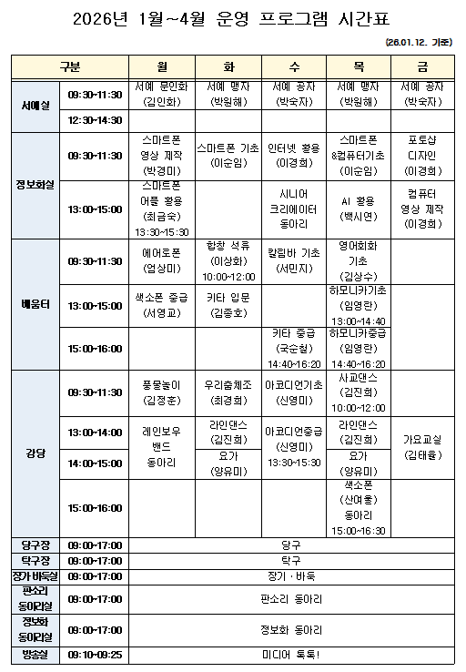 * 각 수업의 시작·종료 시간을 준수하여 프로그매실에 입·퇴실해 주시고, 다른 프로그램 운영에 불편이 없도록 협조 부탁드립니다.
