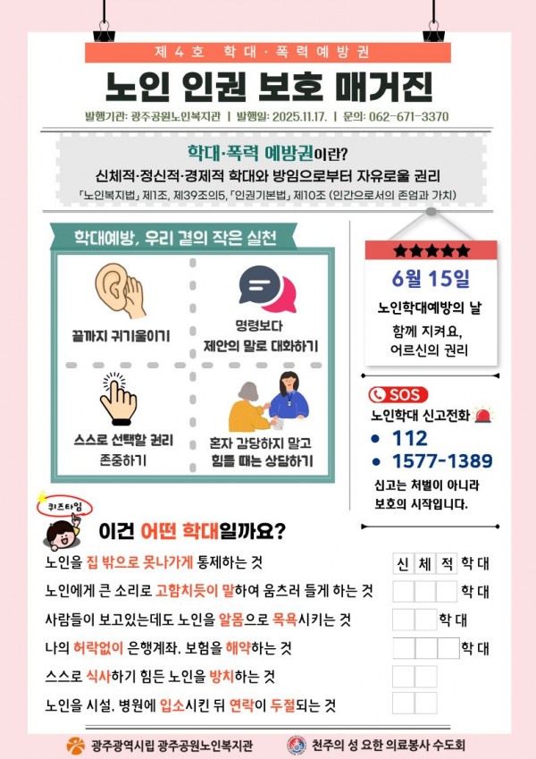 학대·폭력예방권의 개념과 법적 근거를 제시하고, 일상 속 언어폭력이 학대로 이어질 수 있음을 전달하는 『노인 인권 보호 매거진 제4호 – 학대·폭력예방권 편』을 제작·배포하였습니다.