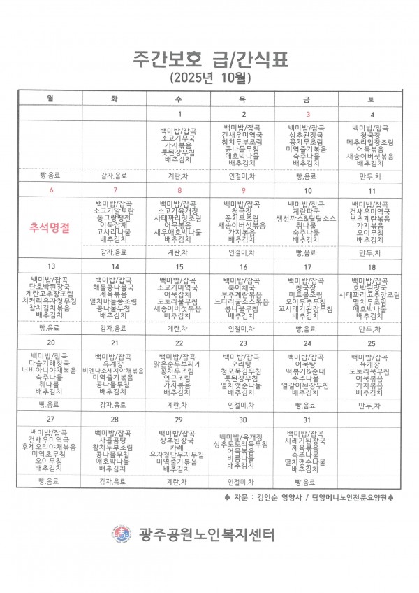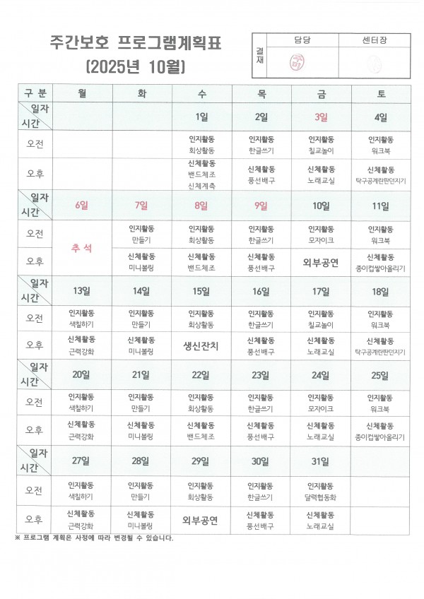 2025년 10월 프로그램계획표와 급.간식표입니다