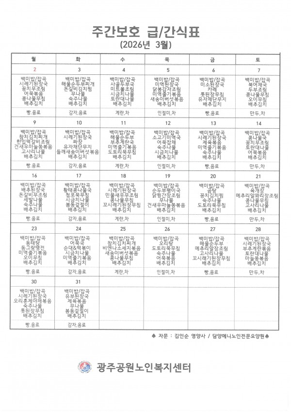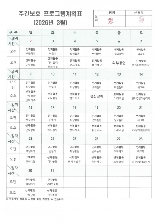 2026년 03월 프로그램계획표와 급.간식표입니다