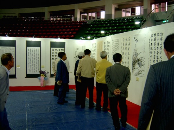 행사 무대 하편에 서예작품전시하여 어르신들이 관람하고 있습니다.