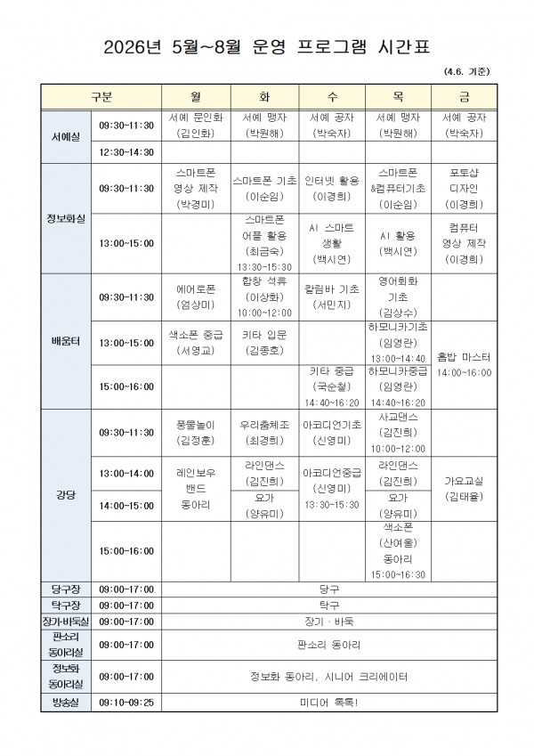 * 프로그램 시간표(첨부 파일)