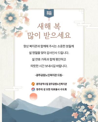 본문 사랑하는 복지관 이용 어르신~ 안녕하세요~ 풍요롭고 넉넉한 명절을 맞아 어르신 가정에 건강과 평안이 가득하시기를 기원합니다. 늘 복지관과 함께해 주시는 어르신들께 깊은 감사의 마음을 전하며, 올 한 해도 웃음과 행복이 가득한 날들 되시기를 바랍니다. 복지관은 언제나 어르신 곁에서 따뜻한 동행이 되겠습니다. 행복한 명절 보내십시오 좋아요 0 행복해요 0 슬퍼요 0