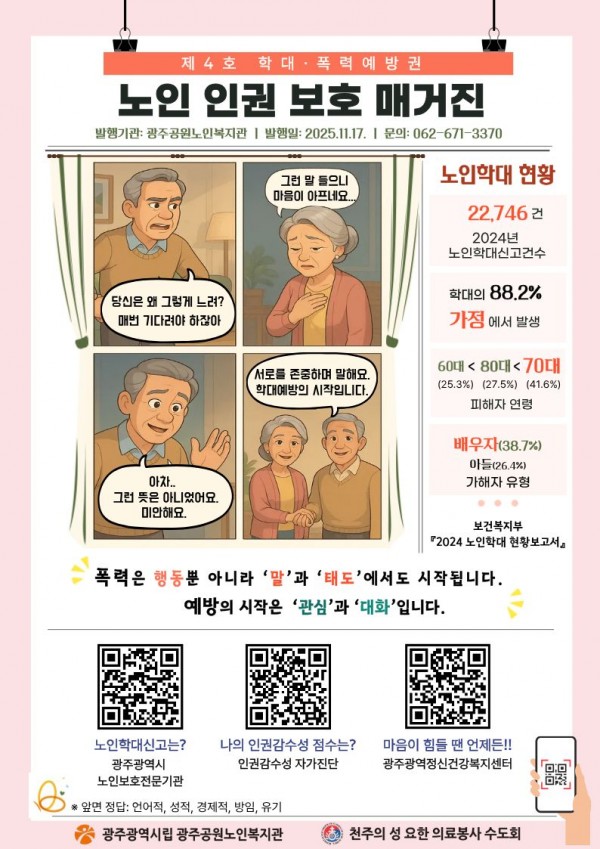 학대·폭력예방권의 개념과 법적 근거를 제시하고, 일상 속 언어폭력이 학대로 이어질 수 있음을 전달하는 『노인 인권 보호 매거진 제4호 – 학대·폭력예방권 편』을 제작·배포하였습니다.