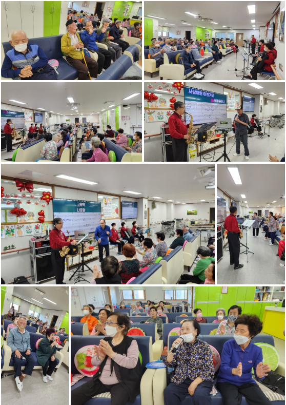 색소폰과 아코디언의 선율, 노래가 어우러진 공연 속에서 어르신들께서는 자연스럽게 박수를 치시고 따라 부르시며 즐거운 시간을 보내셨습니다.