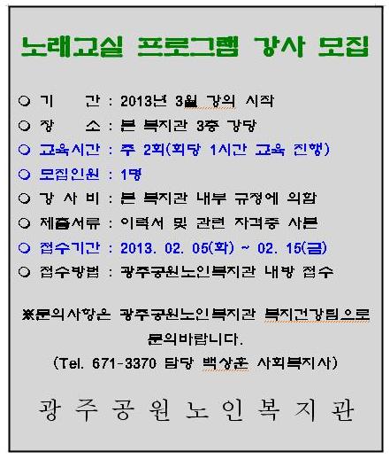 광주공원노인복지관에서 노래교실 프로그램 강사를 모집합니다.